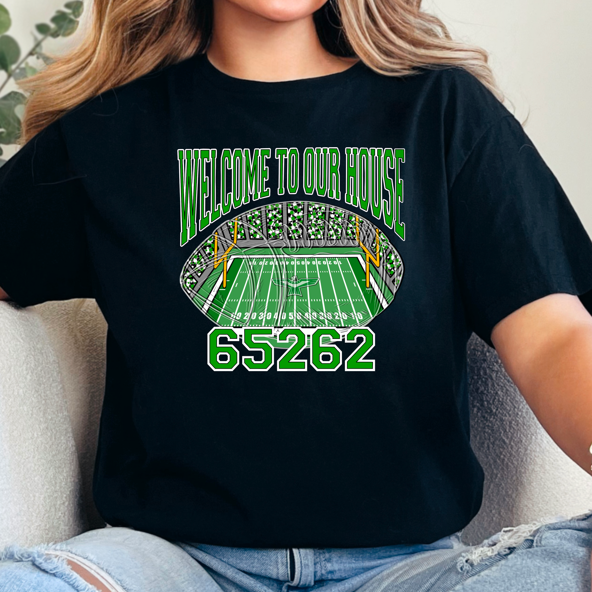 Show your Thunderbird pride loud and clear in this “Welcome to Our House” tee! Featuring a dynamic football stadium scene, green field with the Thunderbird logo, and bold 65262 zip code. The perfect spirited shirt for fans repping North Callaway!