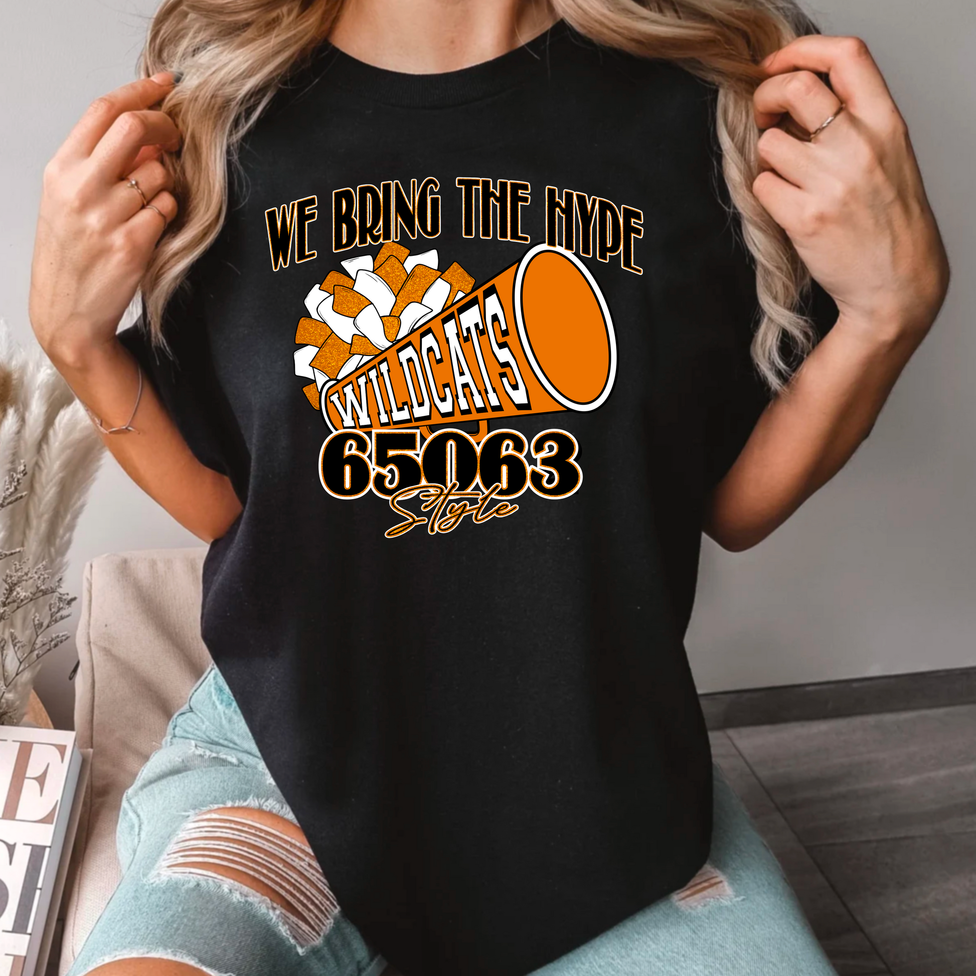 Get loud and proud with this Wildcats Hype Tee! Featuring orange and black school spirit and the local zip 65063, it’s perfect for Friday night lights, pep rallies, or cheering from the stands.