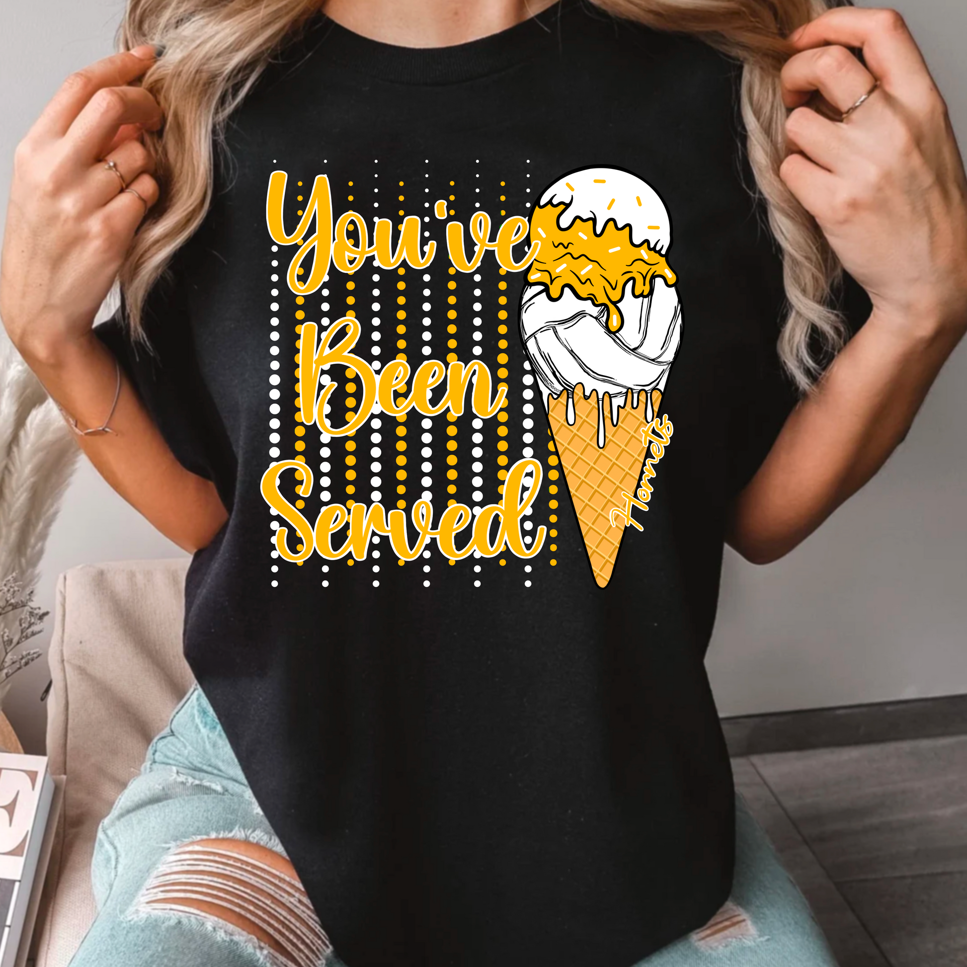 Make a bold play with this “You’ve Been Served” Hornets volleyball tee! Featuring golden yellow and white team colors, a volleyball ice cream cone graphic, and a fun dotted design, this shirt is perfect for players, fans, and proud Hornet families. A sweet and sporty way to celebrate game day!